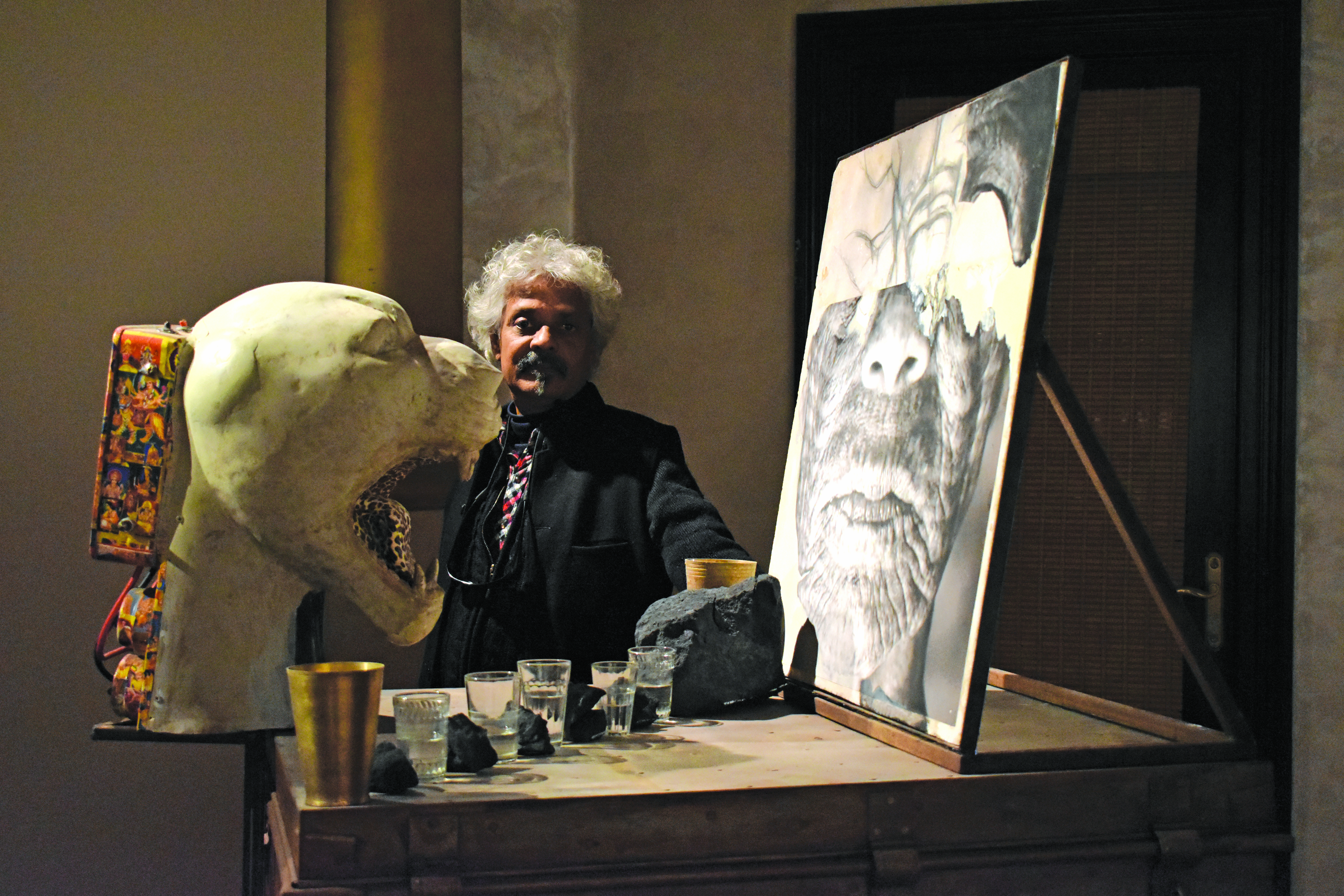 Today, Probir has fused these multiple influences into an art of expanded scope, vision and scale. His paintings are some of the most ambitious, in both size and subject, in contemporary India while his sculptures are increasingly experimental and challenging , to both the viewer and himself. In all his recent works. Probir seeks to address serious issues of an urgent relevancy to India and the world while orchestrating a continuum of mediums that weaves together painting, sculpture, video, photography and installation. His works document the labors of an inquiring mind, the physical manifestations of one artist’s attempt to “agitate the surface” of both a complacent social sphere and a conservative art milieu.